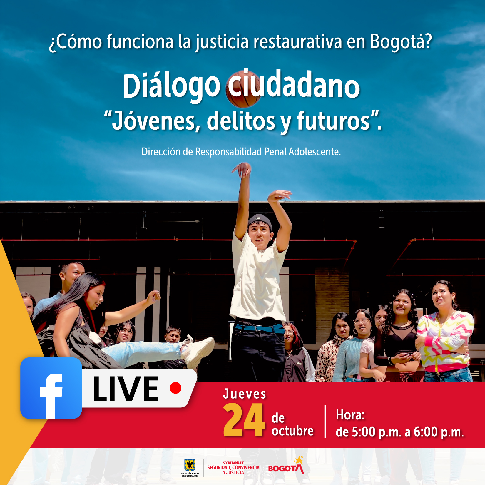 Te invitamos a participar en el Diálogo Ciudadano "Jóvenes, delitos y futuros", el cual se transmitirá por Facebook live el día 24 de octubre de 2024 a las 5:00p.m.