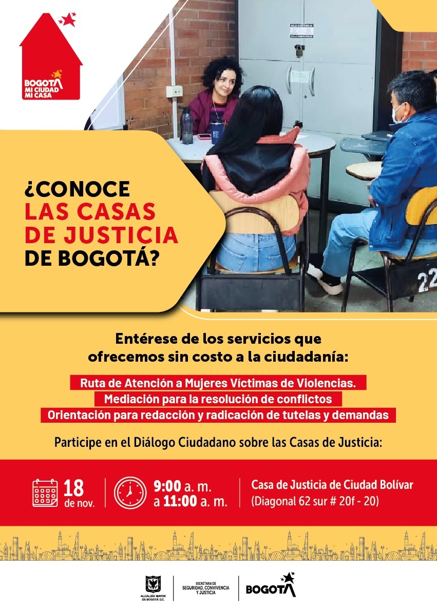 Entérese de los servicios que ofrecemos sin costo a la ciudadanía el 18 de noviembre de 9:00 am a 11:00 am en la Casa de Justicia de Ciudad Bolívar (Diagonal 62 sur No. 20f - 20)